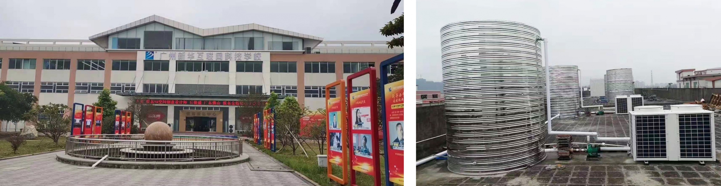 广州新华互联网科技学校——4台10匹金地帕尔空气能热泵机组,日产量40吨热水,每天可提供1000名师生热水供应